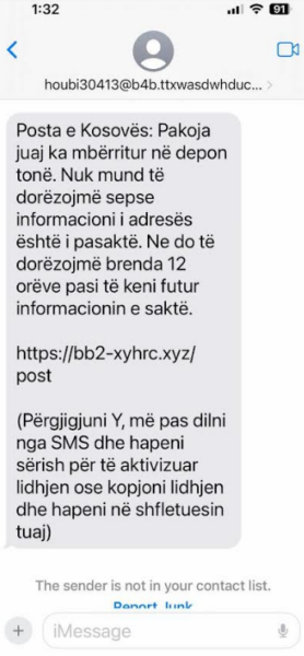 “Të nderuar qytetarë, ju lutëm mos klikoni asnjë link të dërguar përmes këtyre mesazheve dhe të mos bashkëpunoni me numra që nuk janë të Postës së Kosovës. Në asnjë rast, Posta e Kosovës nuk do t’ju kërkojë të dhëna personale apo numër kartele bankare. Edhe posta të tjera në rajon janë sulmuar nga keqbërës të ngjashëm. Posta e Kosovës është e përkushtuar për t’i mbrojtur qytetarët dhe për të bashkëpunuar me organet relevante!”